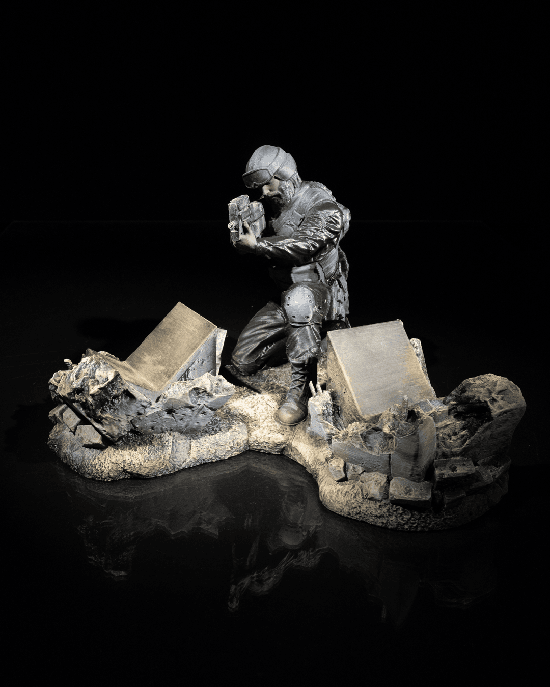 Printed in a stone-grey finish, the sculpt highlights every contour of the operatorβs gear and armor, giving it a museum-style, carved-stone appearance. The sturdy base and forward grip position make it perfect for desks, gaming stations, entertainment centers, or barracks rooms.